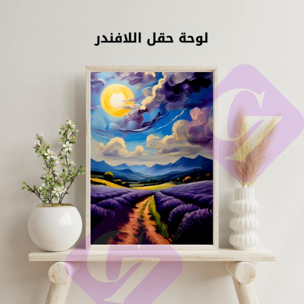لوحة حقل اللافندر ، تم صنع اللوحة بأسلوب الفنان فان جوخ وبالألوان الزيتية الواضحة تظهر اللوحة حقل لافندر وسماء مليئة بالغيوم الداكنة والشمس ساطعة وكأنها تطل كآخر مره قبل الغروب ، تدرجات الألوان واضحة وقوية وتفاصيل الاضاءة وكذلك ضربات الفرشاة بالألوان الزيتية واضحة كما الفنان فان جوخ.
