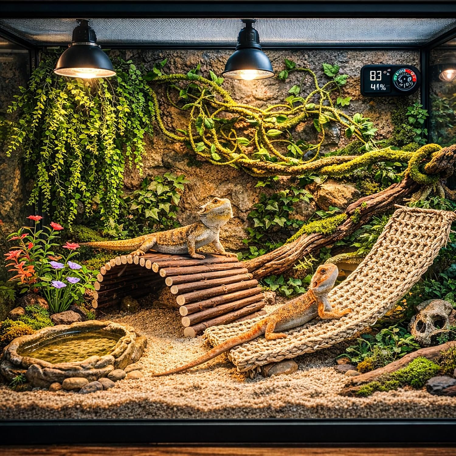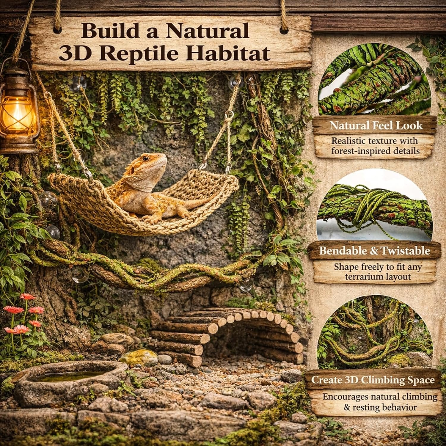【Safe Material & Durable】Bearded dragon hammock is made of natural seagrass. Natural wooden bridge for reptiles to climb. The jungle vine is made of iron wire inside and soft PU material outside. Reptile plants are made from intentionally non-toxic plastic and the stems were made from iron wire. It creates a dynamic environment with fun hiding spots and intriguing obstacles.