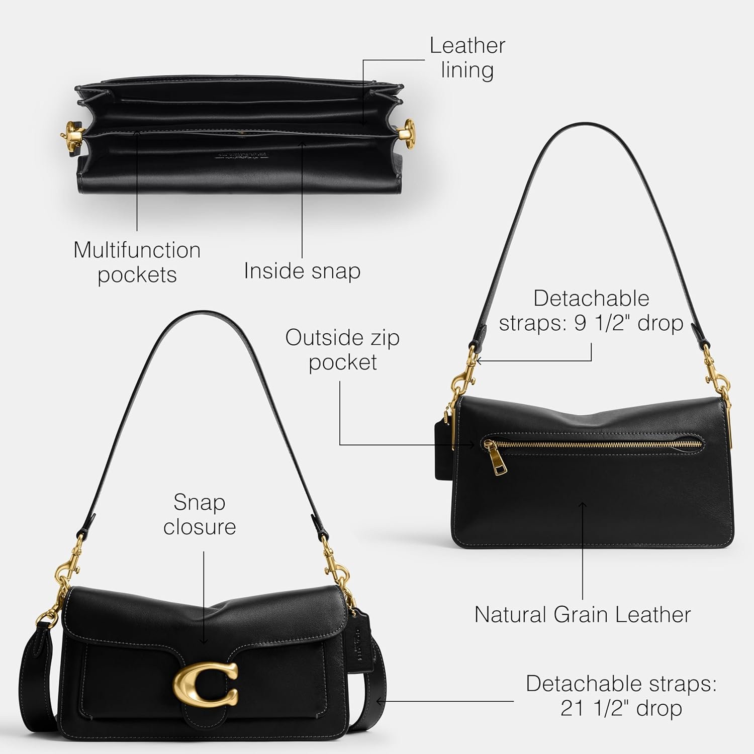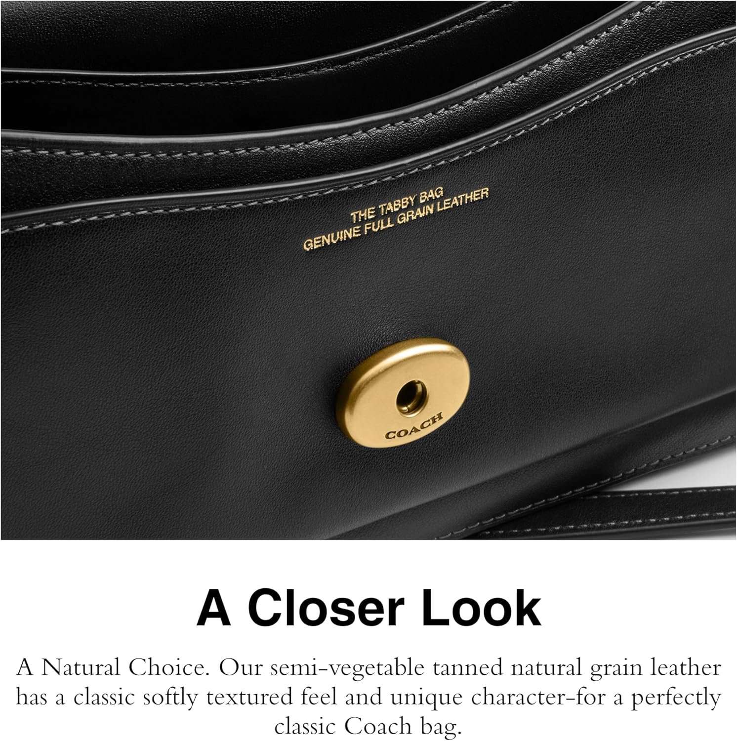 A modern take on an archival 1970s Coach design, our structured Tabby shoulder bag is crafted of natural grain leather and finished with our Signature brass hardware for an iconic touch. This roomy bag features a leather lining, outside zip pocket, detachable short strap with 9 1/2″ drop and detachable long strap with 21 1/2″ drop for shoulder or crossbody wear. 10″ (L) x 5 1/2″ (H) x 2 3/4″ (W)