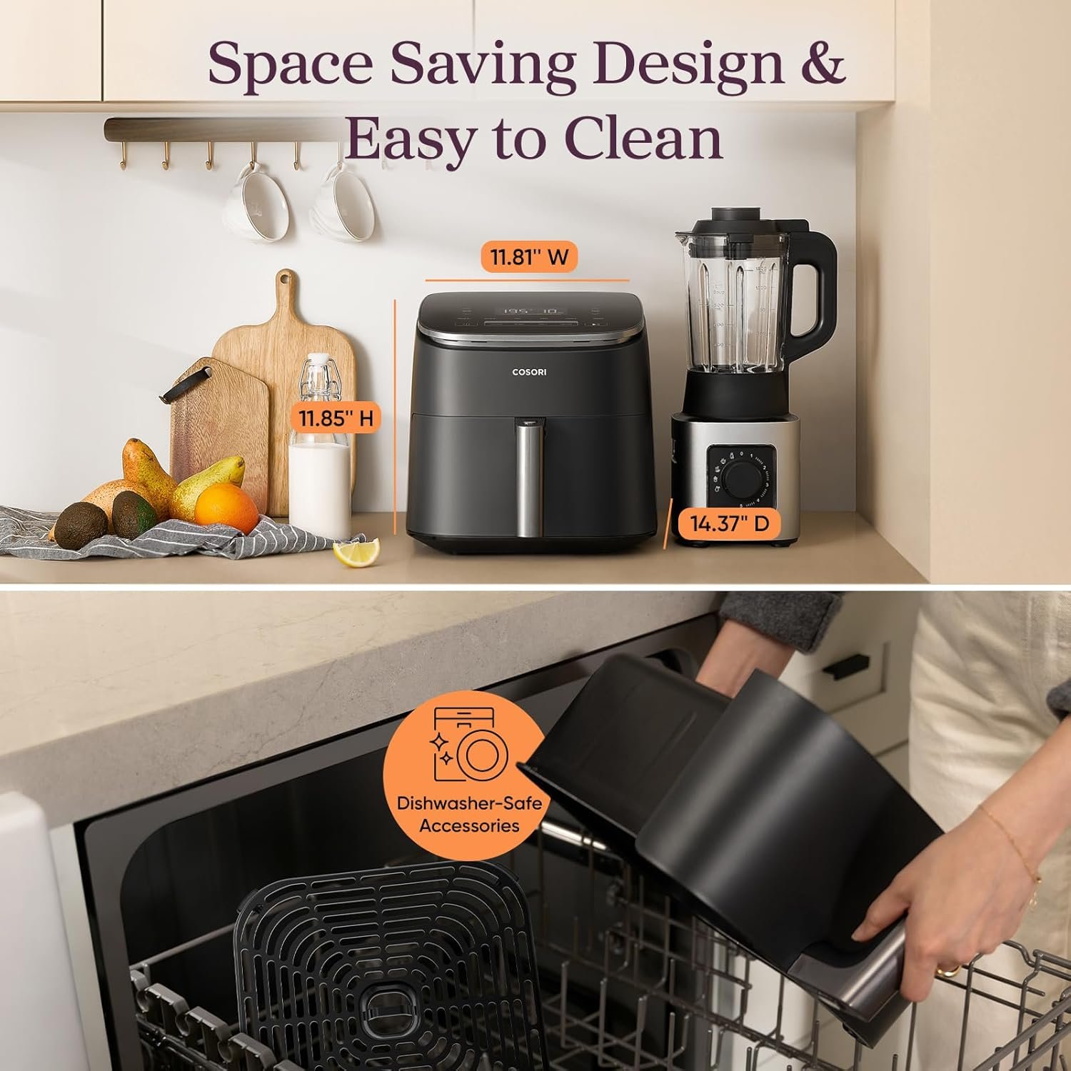 Product Dimensions (including handle): 14.37”D x 11.81”W x 11.85”H ( Leave 13 cm / 5 inches of space behind and above the air fryer. Leave enough room to open the door )