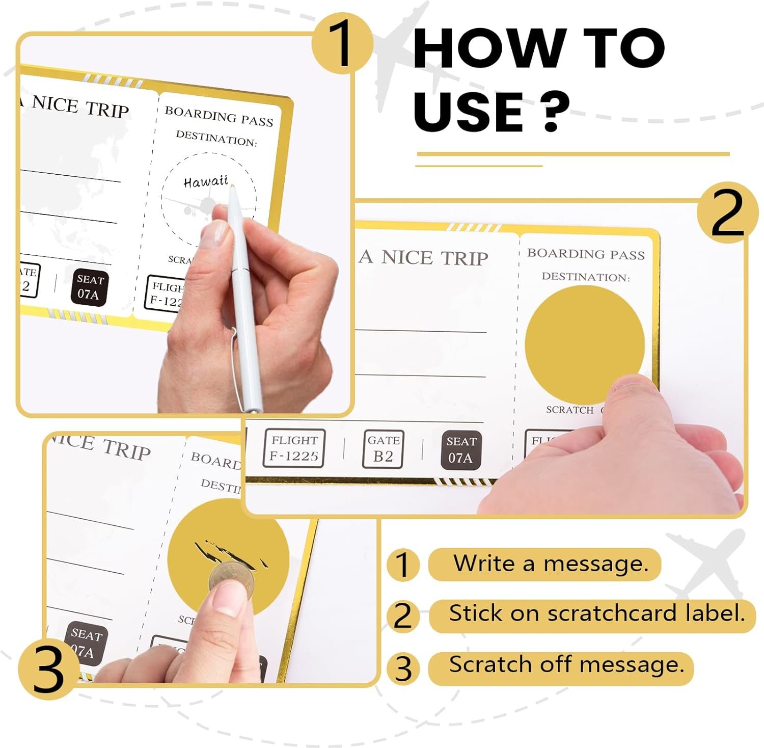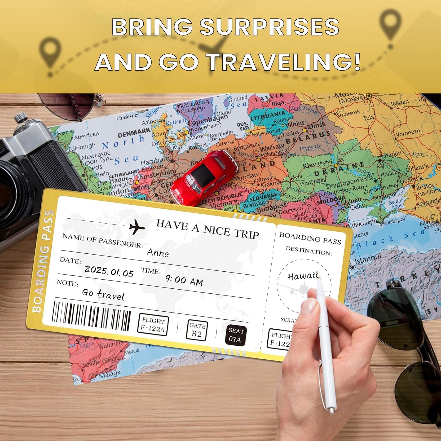 Exquisite Gift Set:1 Pcs of Boarding Pass Gift Tickets, includes 1 Pieces of boarding pass cards, 1 Pieces of gold envelopes and 1 Pieces of matching scratch off labels. Golden Travel Ticket Scratch Off Card with Envelope, Golden Ticket Scratch Off Surprise Travel Reveal.