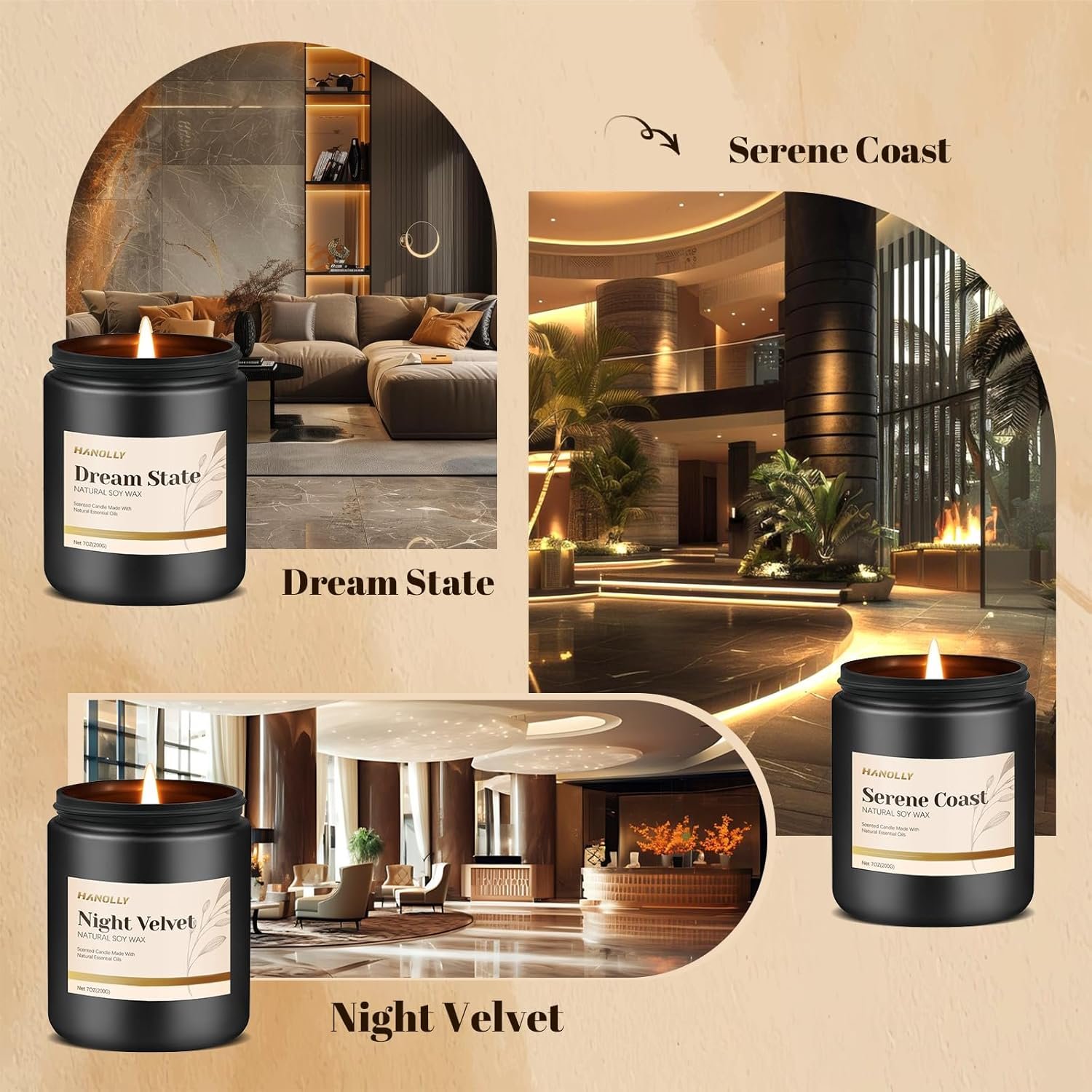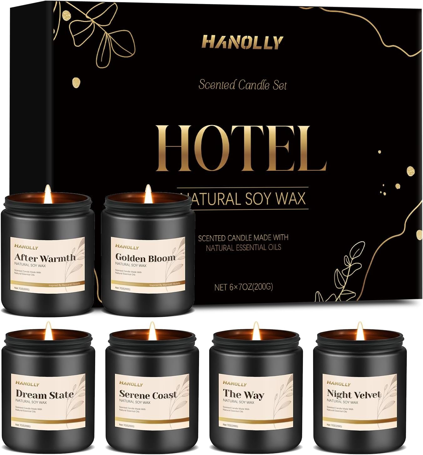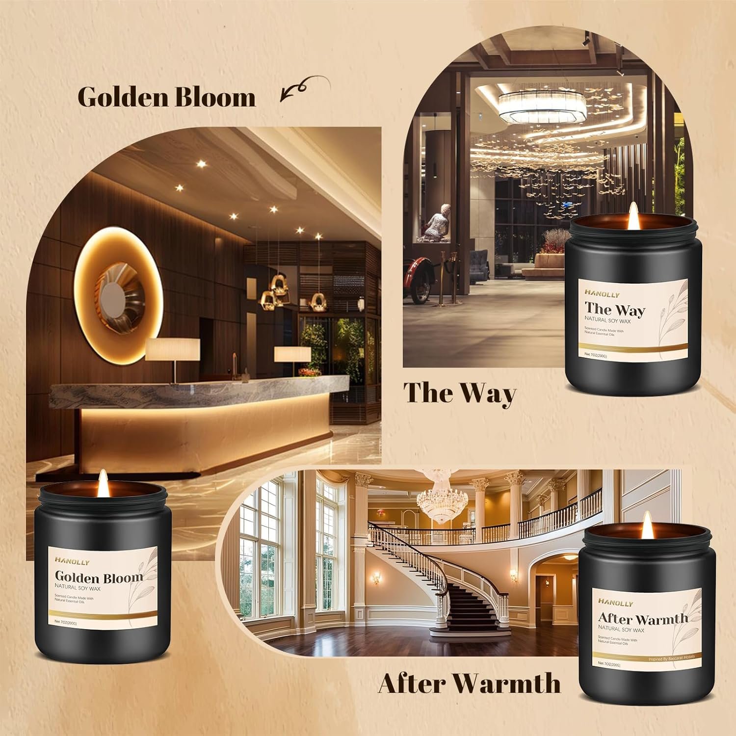 Luxurious Hotel-Inspired Fragrances: ndulge in our hotel scented candle set, featuring six exquisite fragrances: After Warmth, Golden Bloom, Night Velvet, Serene Coast,The Way and Dream State. Each scent is inspired by renowned hotels. Transform your home into a luxurious retreat with these designer candles, perfect for relaxation, meditation or elegant gatherings.