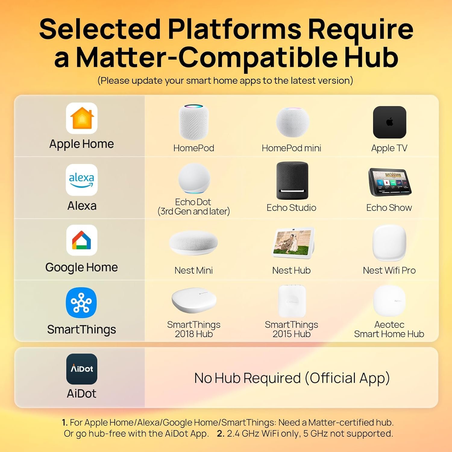 【Easy Setup, One Control】With Matter, Skip the step of downloading and registering multiple manufacturers’ apps every time you buy a new device. Instead, head straight to certified smart home platforms like Apple Home, Alexa, Google Home, SmartThings, or AiDot to control all your Matter devices.【TIP】Matter-certified hub or controller (HomePod, Echo Dot, Nest, SmartThings Hub) is required for Apple Home/Alexa/Google Home/SmartThings platforms. Alternatively, the AiDot app can be used without hub