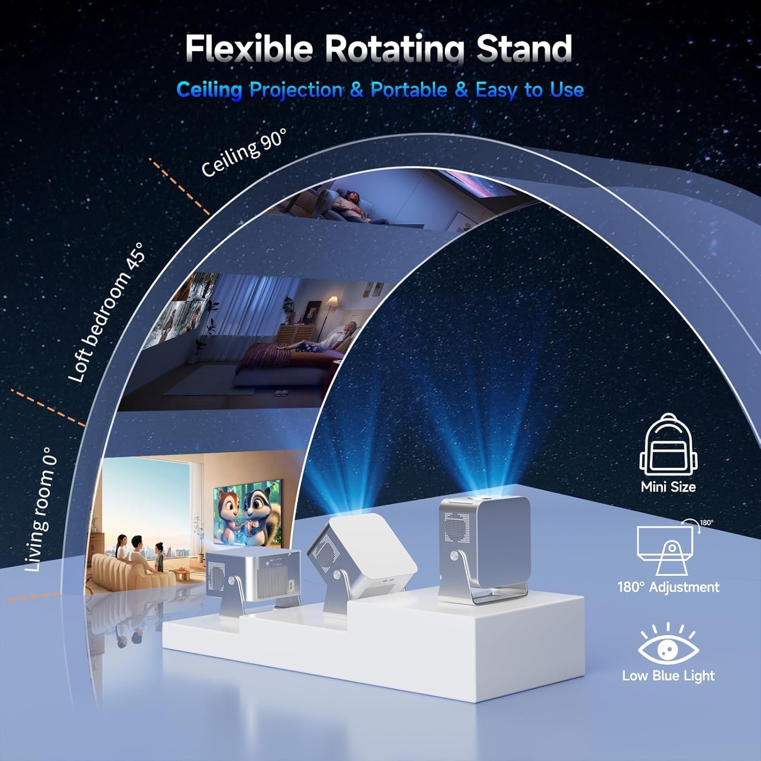 Dual-Band Wi-Fi 5 & Bluetooth 5.1: Our smart projector features the latest dual-band Wi-Fi (2T2R 802.11 a/b/g/n/ac 2.4G&5G WIFI), delivering fast and stable performance for buffer-free streaming and lag-free gaming projection. Bluetooth 5.1 technology offers faster speeds, longer range, and better connectivity, allowing seamless pairing with speakers, wireless headphones, and other favorite audio devices.