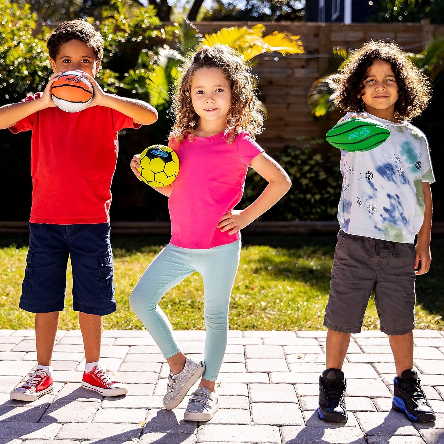 THREE SPORT PACK: This set comes complete with (3) NERF sports balls: (1) mini football, (1) mini soccer ball, and (1) mini basketball