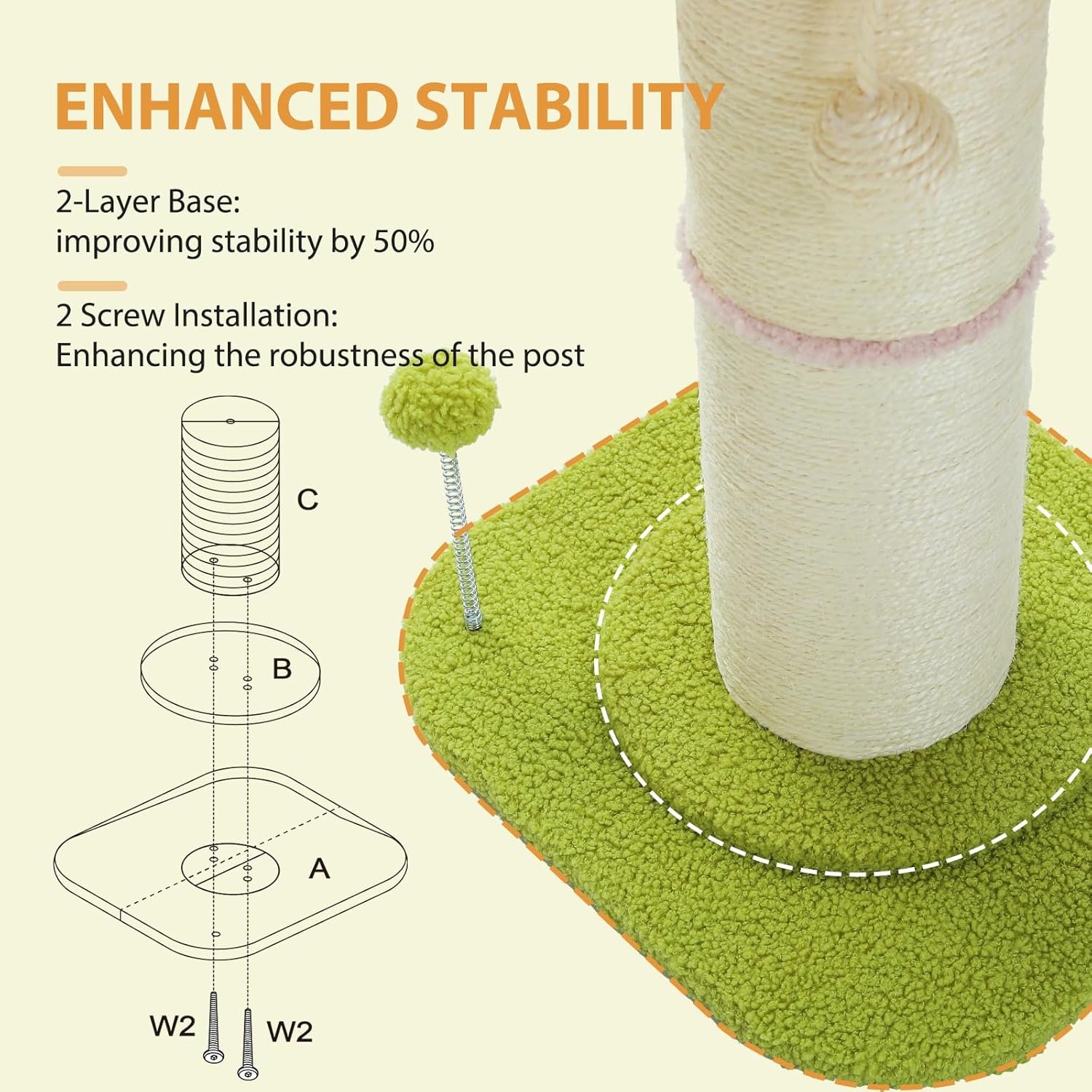 ENLARGED DOUBLE BASE: With extra-reinforced double large base, this tall cat scratching post for indoor cats can easily hold on when your cats are scratching or jump into the top bed