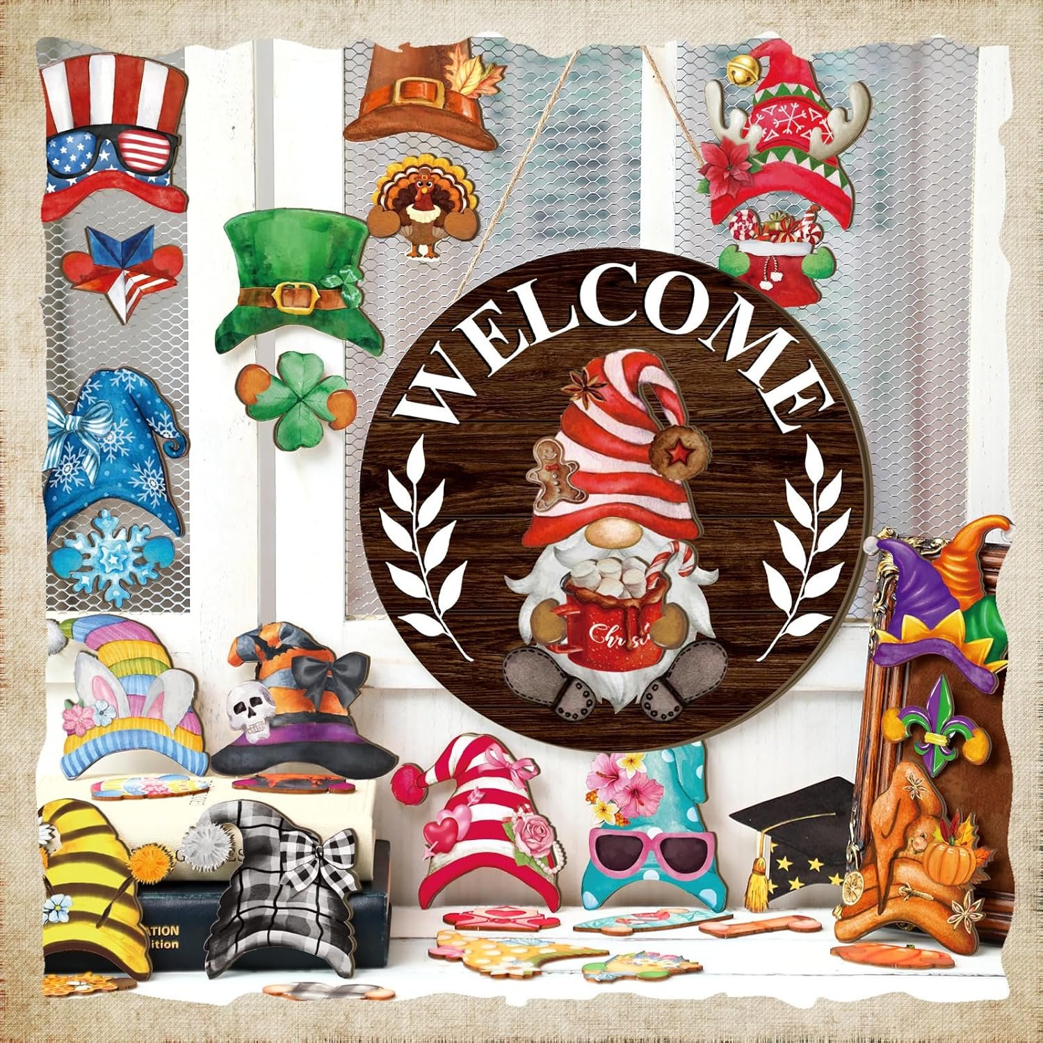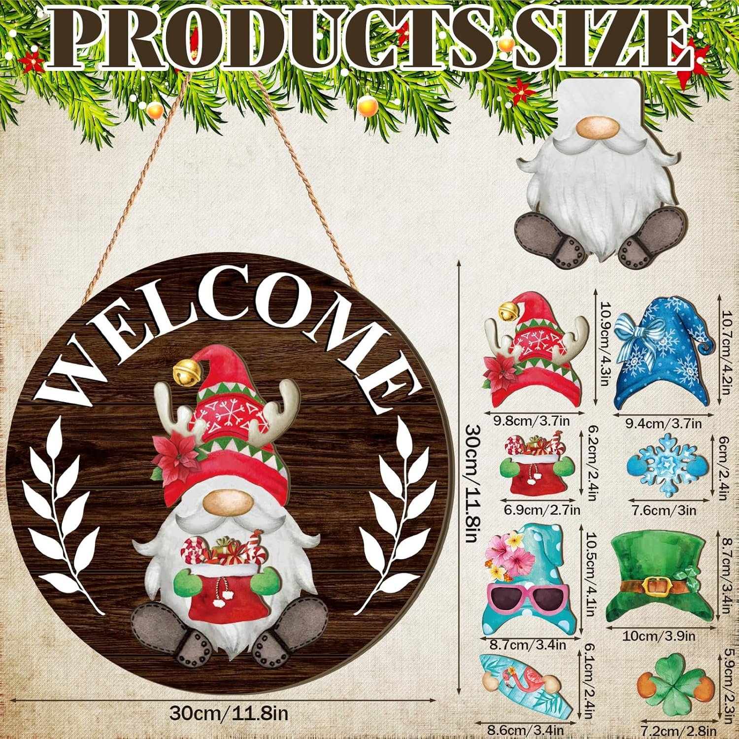 Material and Size: the Interchangeable winter wooden Gnome decors are made of wooden material, strong and reusable, safe and reliable, light and portable; The wall hanging sign is about 12 x 12 inches/ 30 x 30 cm, the size of the hat is about 4.05 x 3.62 inches