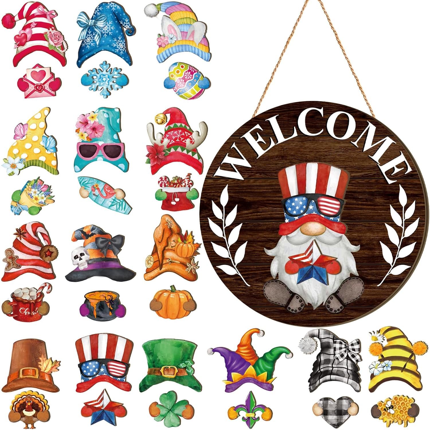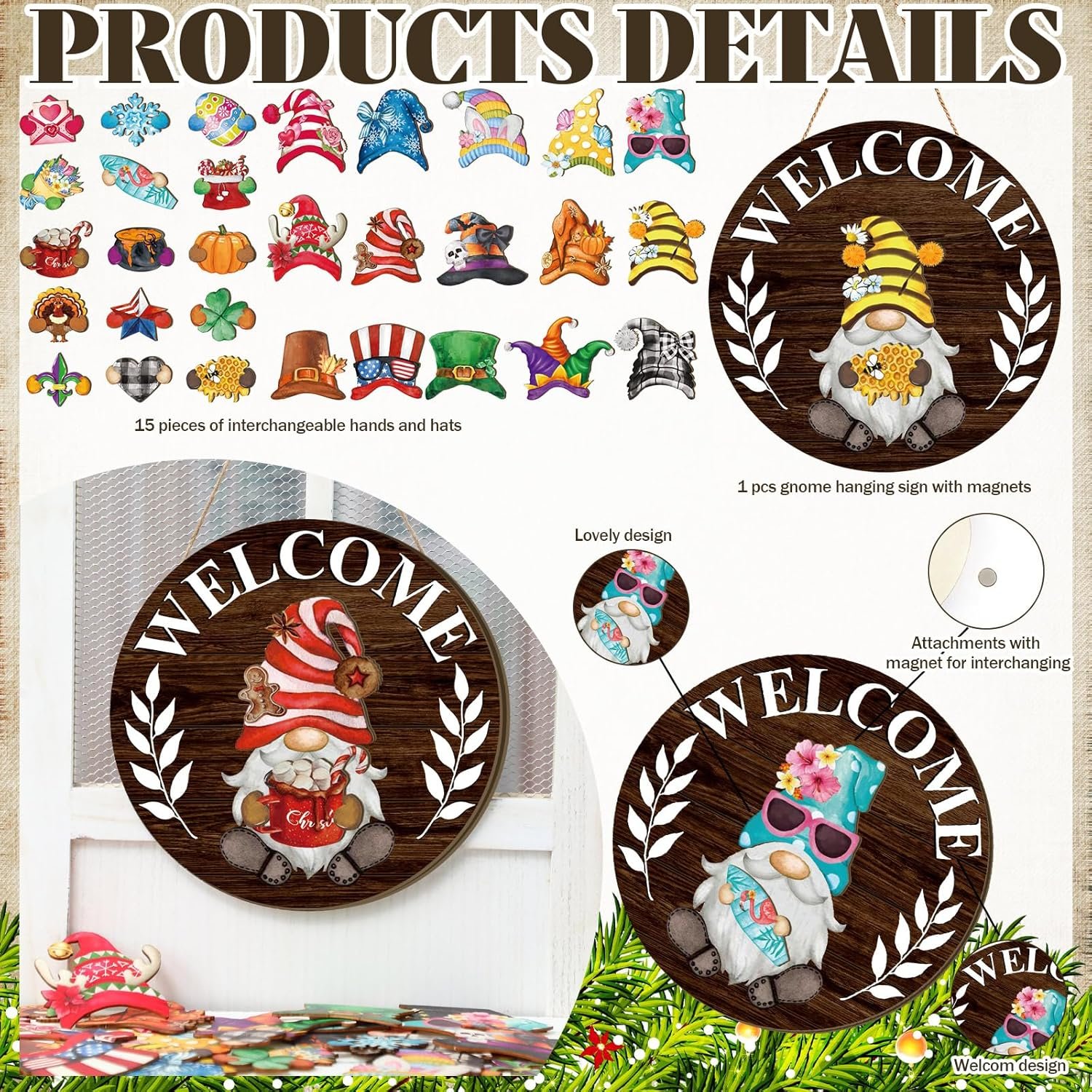 Interchangeable Welcome Sign: you will receive 1 welcome home sign, with 15 detachable hats, and 15 seasonal accessories, each with a magnet for easy replacement, numerous styles are convenient for you to combine at will, which can meet your daily needs
