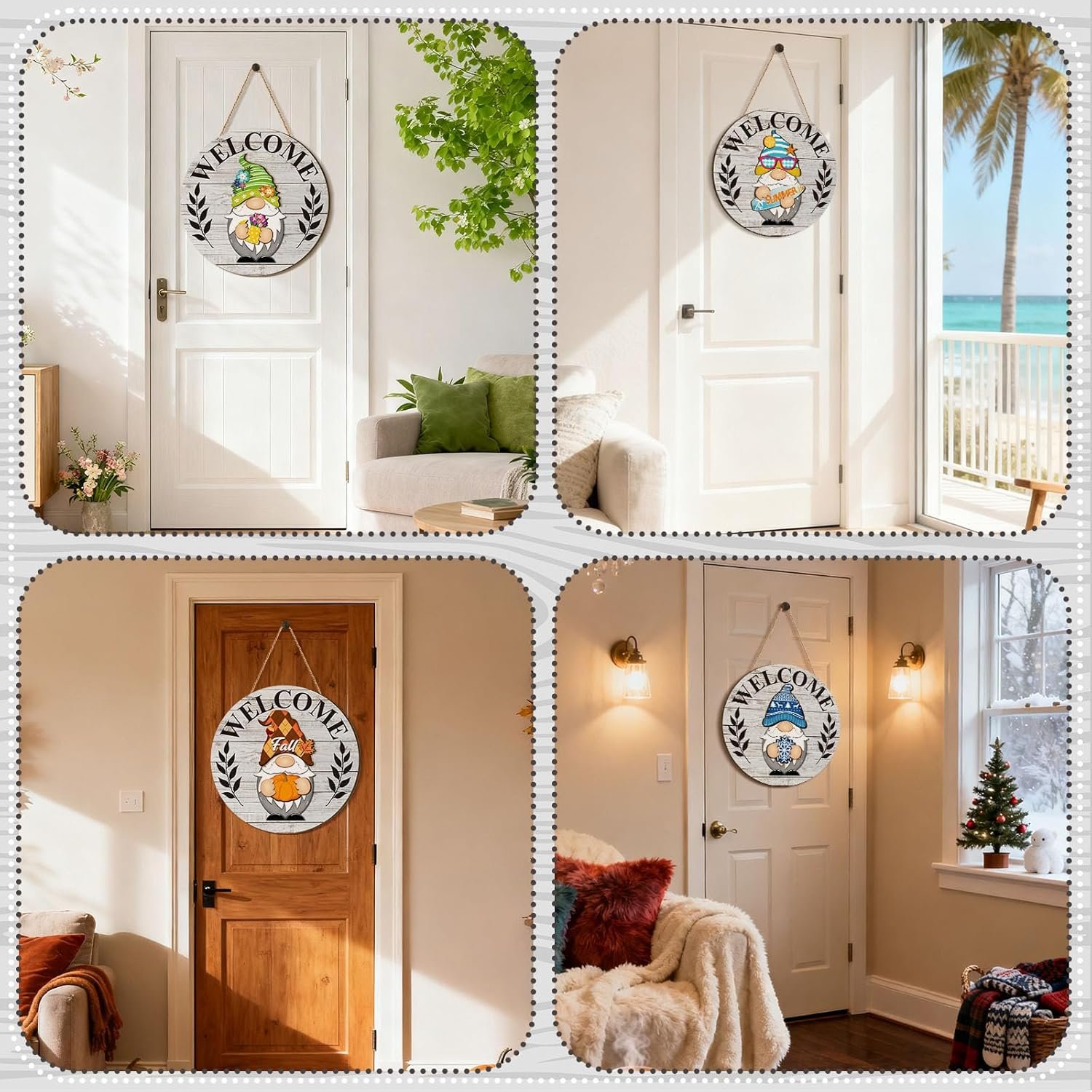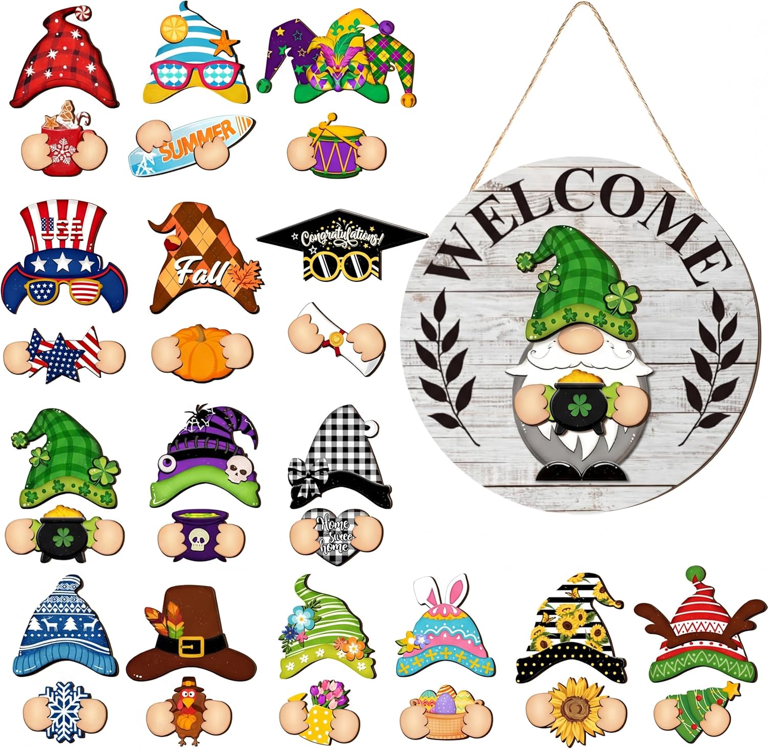 Qunclay Interchangeable Wooden Gnome Decor Holiday Seasonal Gnome Decorations with Magnet Pieces and Detachable Hats Changeable Welcome Sign for Home(White)