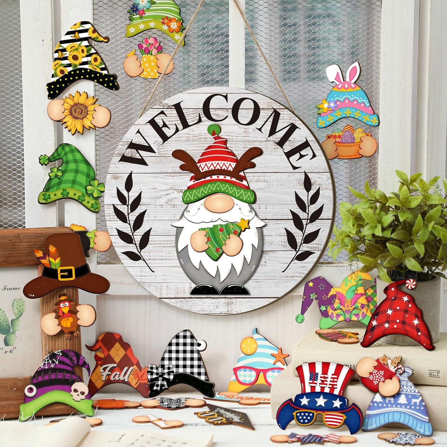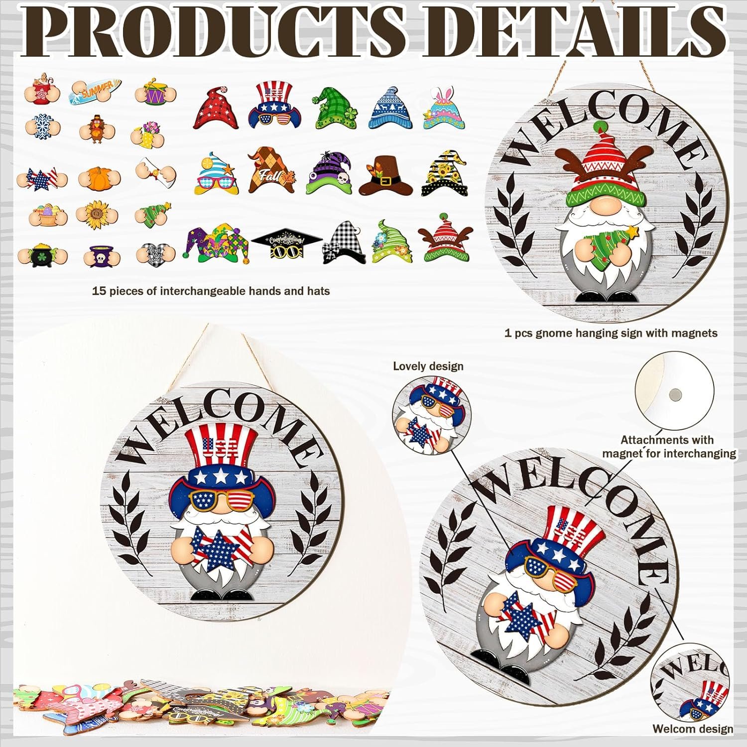 Interchangeable Welcome Sign: you will receive 1 welcome home sign, with 15 detachable hats, and 15 seasonal accessories, each with a magnet for easy replacement, numerous styles are convenient for you to combine at will, which can meet your daily needs