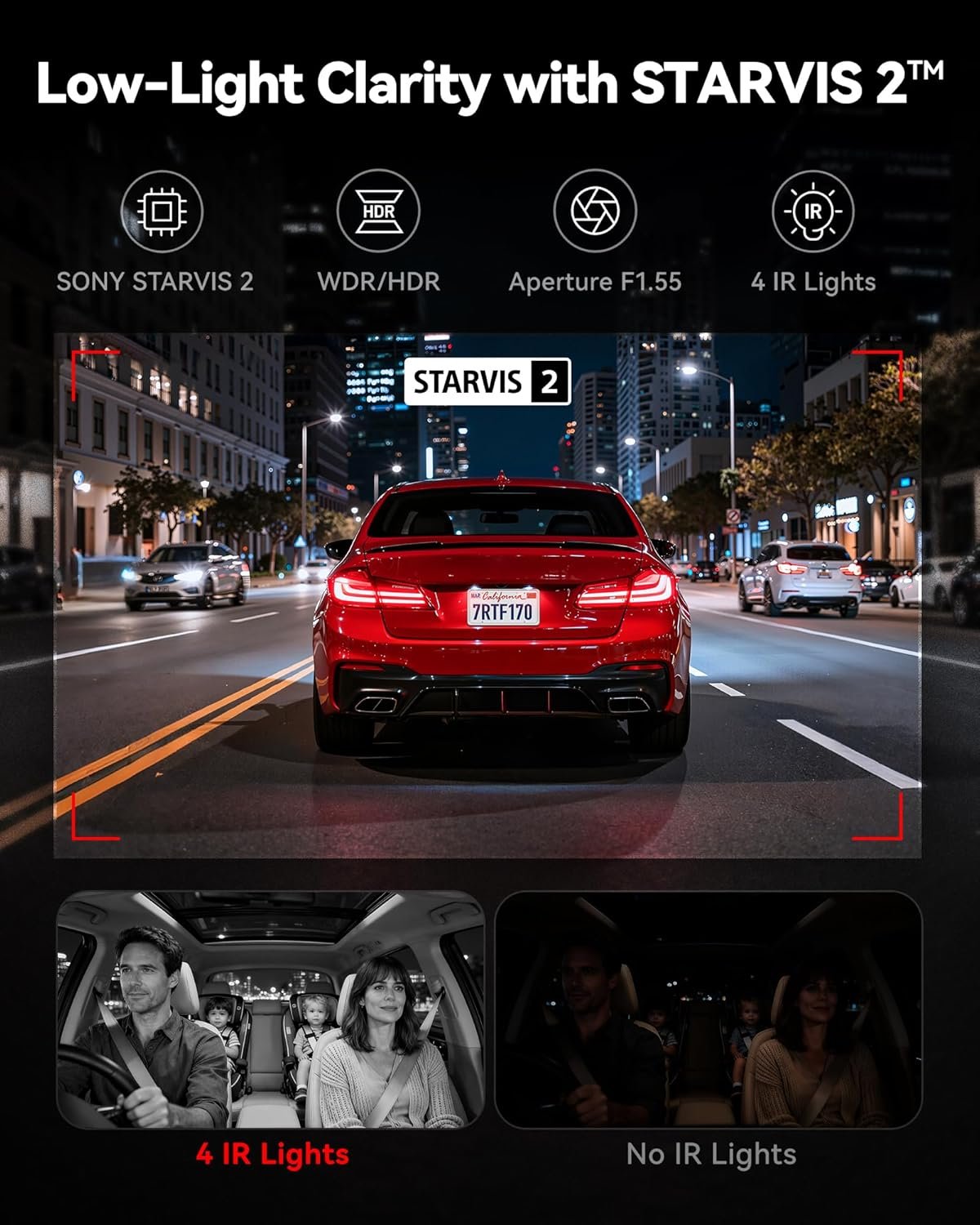 [STARVIS 2 IMX675 Low-Light Performance] Equipped with STARVIS 2 IMX675 sensor, WDR and HDR technology, this REDTIGER 4K dash cam significantly improves dynamic range and low-light performance. The larger pixel structure enhances brightness while minimizing motion blur and image noise. With dash cam front and rear inside coverage, every detail remains sharp even in dim streets or nighttime highways.