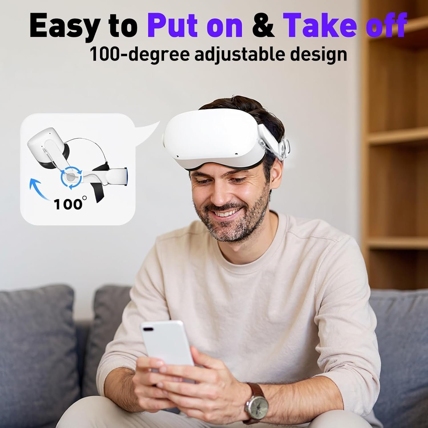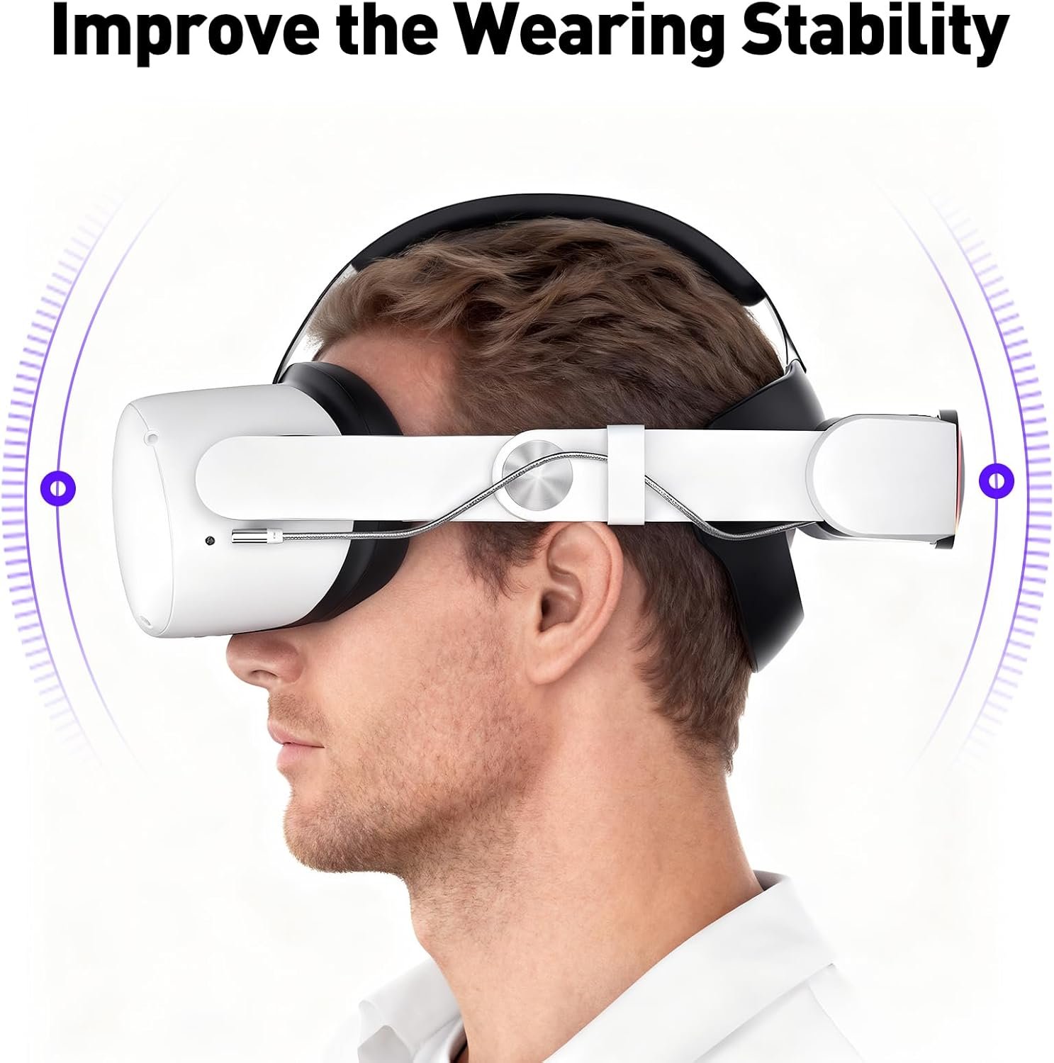 【Ergonomic Comfort & Custom Fit】Designed for maximum comfort, the head strap for Meta Quest 2 / Oculus Quest 2 features a 52° adjustable hinge, making it easy to take on and off. The TPR head pad enhances breathability and moisture absorption for a more comfortable fit. The 360° rotatable knob allows for easy size adjustments, making it suitable for users of all head sizes, including those who wear glasses.