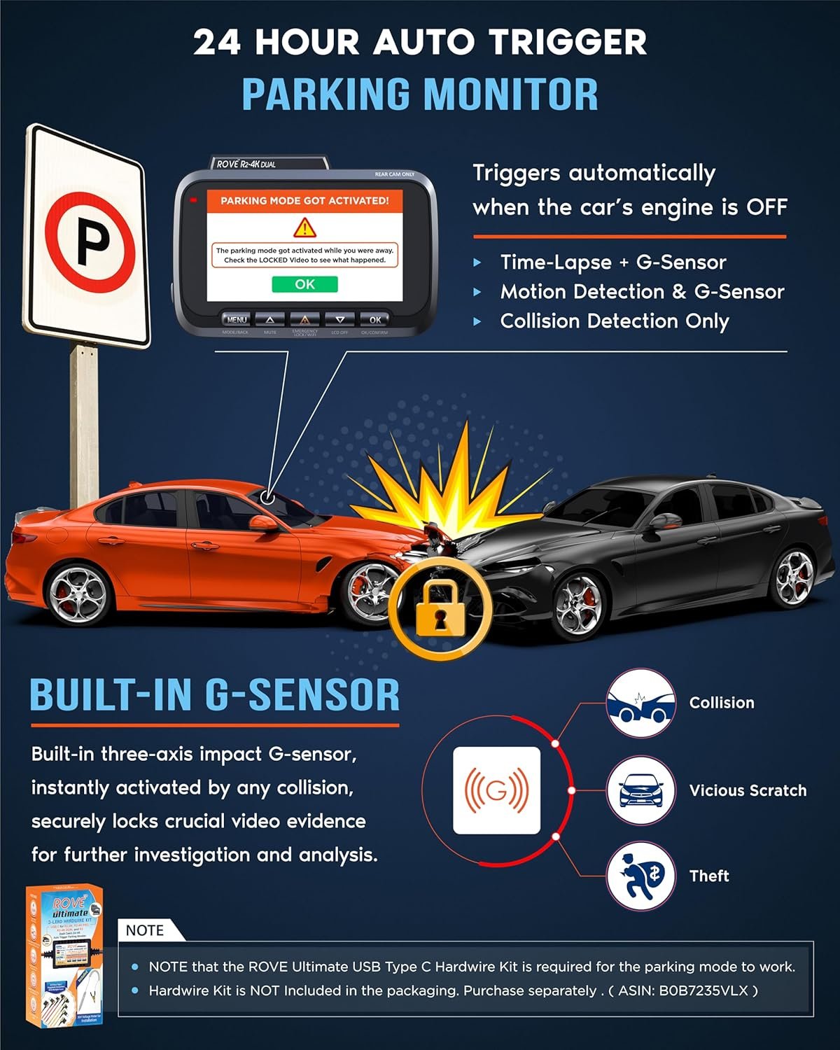 Our 24/7 CUSTOM DESIGNED PARKING MODE – R2-4K DUAL offers three options for its custom-designed 24hr parking mode with voice guidance. 1fps timelapse video, motion detection, and collision detection. A hardwire kit is required (buy separately, ASIN: B0B7235VLX). If an event occurs in the park, then the camera will record a full 1-min video, lock it safely in an event folder, and give you a voice alert the next time you start your car letting you know that event has occurred while you were away.