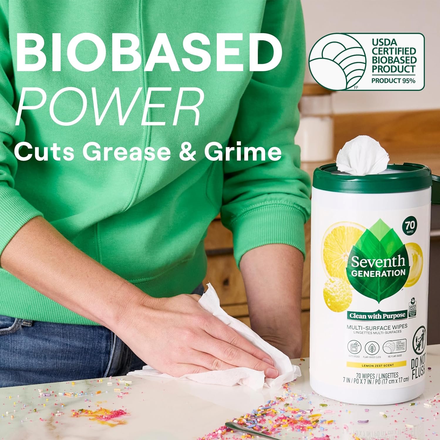 Make quick work of everyday messes with Seventh Generation Multi Purpose Wipes. They’re perfect as an all-purpose cleaner for anytime cleaning on kitchen counters, appliances, bathrooms, kids’ toys—and most surfaces in your busy home. Our all purpose cleaner wipes are a 98% USDA Certified Biobased product, providing a powerful clean with one-step convenience, and without dyes or synthetic fragrances. Plus, our lemon zest scent is made from essential oils and botanical ingredients, for a smell that’s delightfully refreshing and isn’t overpowering. Try all of our Seventh Generation household products; all purpose cleaner, wood cleaner, glass cleaner, granite cleaner, stone cleaner, toilet bowl cleaner, and disinfectant cleaner products. At Seventh Generation, we do business differently. We believe our multipurpose cleaner and cleaning supplies are healthy solutions for use within your home–and for the community and environment outside it. We are always evaluating how to reduce their environmental impact, increase performance and safety, and create a more sustainable supply chain. Furthermore, we believe it is our responsibility to set a course for a more mindful way of doing business, where companies act as partners with other stakeholders to create a brighter future for the whole planet. Seventh Generation is proud to be a Certified B Corporation. B Corps are certified to be better for workers, better for communities, and better for the environment. By choosing Seventh Generation all purpose cleaner products, you’re joining us in nurturing the health of the next seven generations.