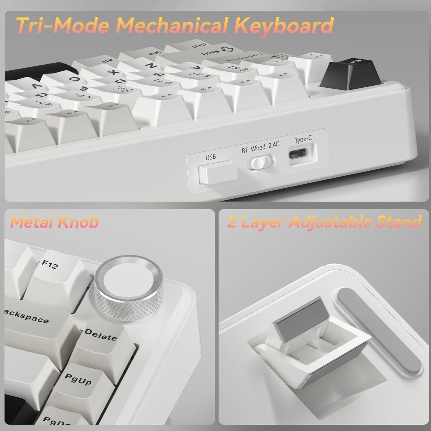 Compact Keyboard with Multifunctional Metal Knob: This 75 percent keyboard features a compact 81 keys while retaining essential gaming arrow keys. It saves valuable desk space and offers portability. And it equipped with a multifunctional rotary knob, it switches between gaming and office modes. In gaming mode, a short press selects lighting patterns, while rotating adjusts brightness. In office mode, a short press can mute or demute the device. Rotating the knob adjusts the volume