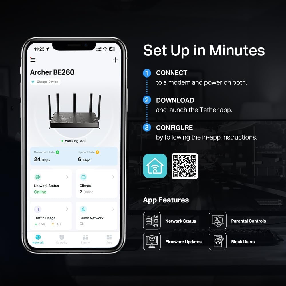 𝐄𝐚𝐬𝐲 𝐒𝐞𝐭𝐮𝐩 𝐚𝐧𝐝 𝐔𝐬𝐞 – Set up your Archer BE260 in minutes and manage network settings with the Tether app (Android or iOS) or web interface.