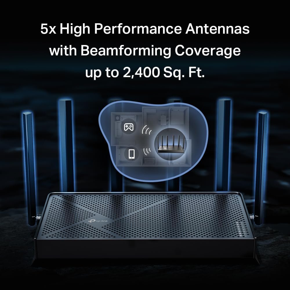𝐖𝐢𝐝𝐞 𝐂𝐨𝐯𝐞𝐫𝐚𝐠𝐞 𝐰𝐢𝐭𝐡 𝐒𝐭𝐫𝐨𝐧𝐠 𝐂𝐨𝐧𝐧𝐞𝐜𝐭𝐢𝐨𝐧 – Get up to 2,400 sq. ft max coverage for up to 80 devices at a time. 5 optimally positioned antennas and Beamforming technology focus Wi-Fi signals toward hard-to-cover areas for stronger coverage.